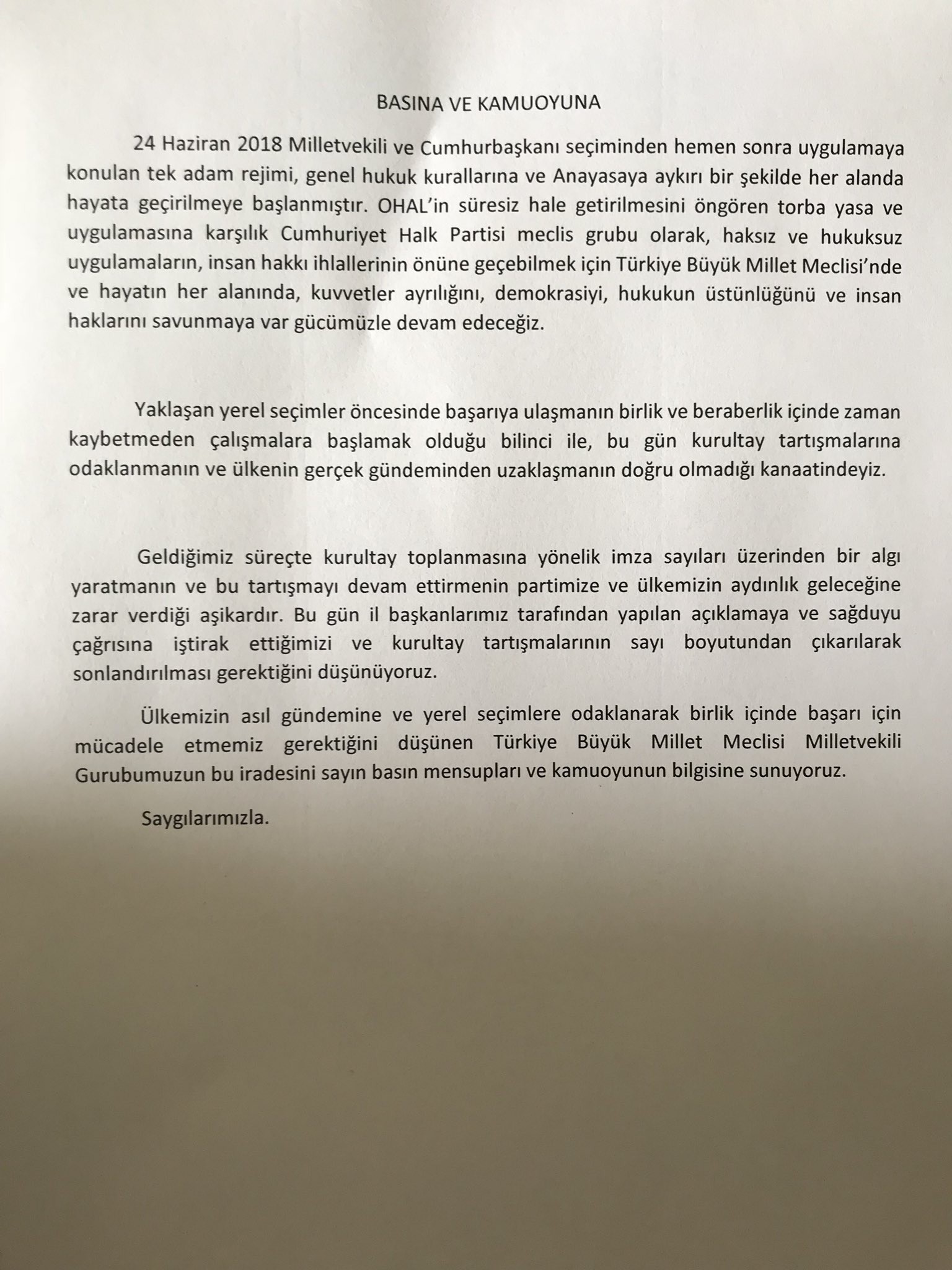 CHP’nin, haksız ve hukuksuz uygulamaların, insan hakkı ihlallerinin önüne geçebilmek için Mecliste ve hayatın her alanında, kuvvetler ayrılığını, demokrasiyi, hukukun üstünlüğünü ve insan haklarını savunmaya var gücüyle devam edeceğinin belirtildiği bildiride, “Yaklaşan yerel seçimler öncesinde başarıya ulaşmanın birlik ve beraberlik içinde zaman kaybetmeden çalışmalara başlamak olduğu bilinci ile, bu gün kurultay tartışmalarına odaklanmanın ve ülkenin gerçek gündeminden uzaklaşmanın doğru olmadığı kanaatindeyiz.” denildi.