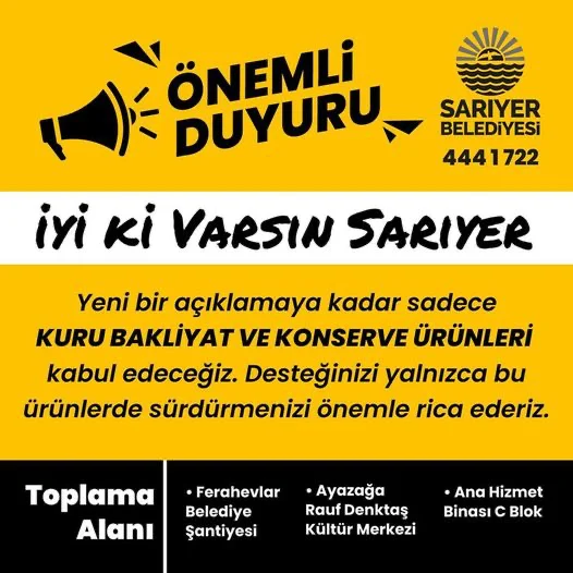 Vatandaşlardan gelen yardımlar Sarıyer Belediyesi yardım toplama alanlarında toplandı, Ana Hizmet Binası C Blok, Ayazağa Rauf Denktaş Kültür Merkezi, Ferahevler Belediye Şantiye’den deprem bölgesine direkt gönderilen Tırlar ilçelere dağıldı.