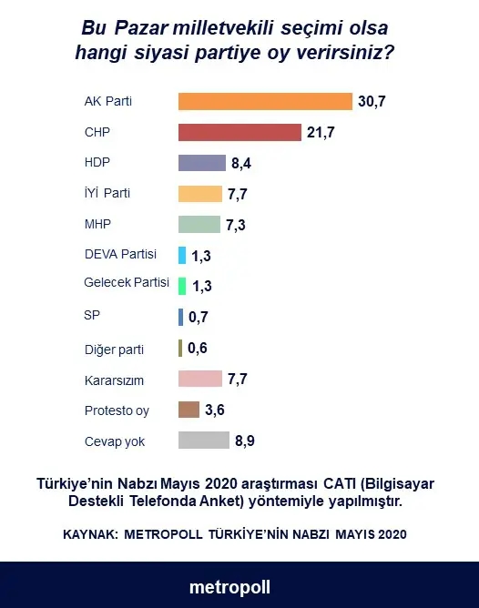 MetroPOLL Araştırma’nın ‘Türkiye’nin Nabzı Mayıs 2020’ anketine göre partilerin oy oranları şöyle: