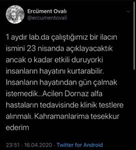 “1 aydır lab.da çalıştığımız bir ilacın ismini 23 nisanda açıklayacaktık ancak o kadar etkili duruyorki insanların hayatını kurtarabilir. Insanların hayatından gün çalmak istemedik..Acilen Dornaz alfa hastaların tedavisinde klinik testlere alınmalı. Kahramanlarima tesekkur ederim