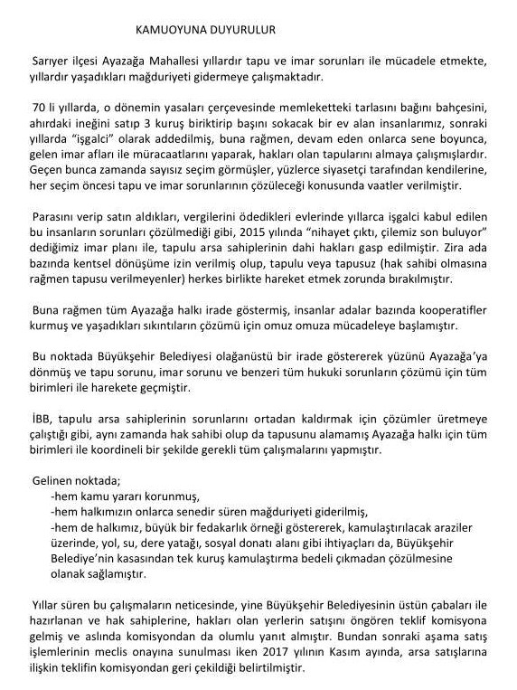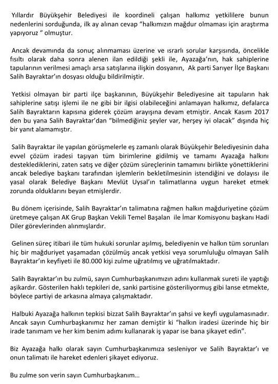 Ayazağa da 124-125 sokak olarak bilinen bölgede oturun 600 aile tapuların verilmesini İBB’de AKP İlçe Başkanı Salih Bayraktar tarafından engellendiğini belirterek basın açıklaması yaptılar.