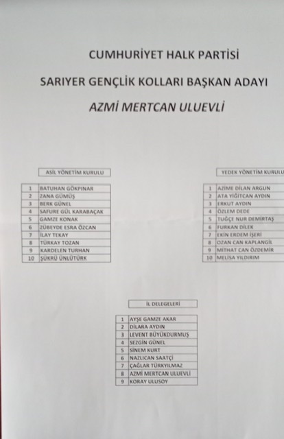 CHP Sarıyer İl Delegesi ve Canan Kaftancıoğlu Başkanlığında İl Yönetim Kurulu yedek üyesi Azmi Mertcan Uluevli Sarıyer’de Gençlik Kolu Başkanı oldu.