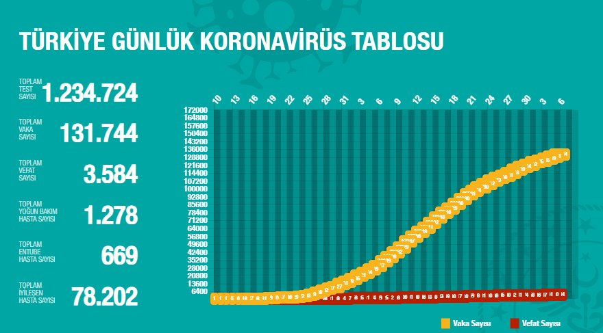 Corona virüsü nedeniyle bugün 64 kişi ise hayatını kaybetti. Açıklanan son verilerin ardından Türkiye’deki toplam vaka sayısı 131 bin 744, toplam vefat sayısı ise 3 bin 584 oldu.
