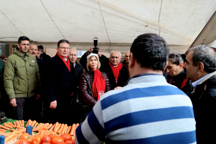 Ekonominin kötü gidişatının sorumluları vatandaşın sesini duymuyor. Vatandaşımız gönül rahatlığıyla ihtiyaçlarını karşılayamıyor. Pazarcımız ürününü satamıyor. Üreticimiz artan maliyetler karşısında çaresiz. Sosyal belediyecilik uygulamalarımızla tüm komşularımızın derdine derman olacak projelerimizle geliyoruz. Bugün pazarcı arkadaşımın önlüğünü taktım. Vatandaş ürünün fiyatını görünce almaktan vazgeçti. Komşularımızın evine istediğini alıp götüremediği bir gerçeklikle karşı karşıyayız. Biz komşularımızın, hiçbir kaygı duymadan pazar alışverişini gönül rahatlığıyla yapacağı koşulların yaratılması için çalışacağız. Hiç durmadan çalışacağız. Çünkü komşularımızın sırtındaki yükü hafifletmeyi asli görevimiz kabul ettik’ dedi.