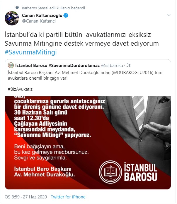 İstanbul CHP İl Başkanı Canan Kaftancıoğlu, İstanbul Barosu Başkanı Avukat Mehmet Durakoğlu’nun duyurduğu Savunma Mitingi için davette bulundu.