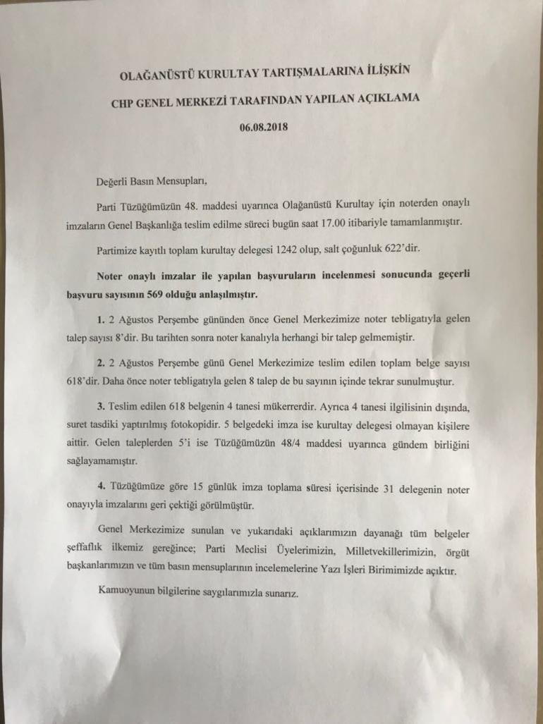 CHP Genel Merkezi’nin açıklaması şöyle: