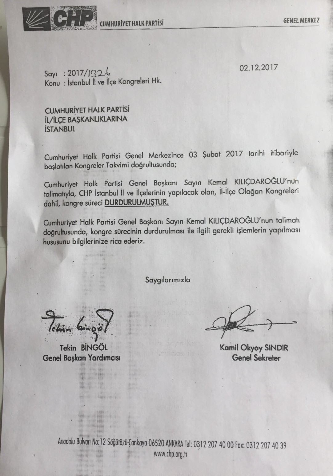 Cumhuriyet Halk partisi Genel Başkanı Kemal Kılıçdaroğlu’nun talimatıyla, CP istanbul il ve ilçelerinin yapılacak olan , İl -İlçe Olağan Kongreleri dahil Kongre süreci DURDURULMUŞTUR.