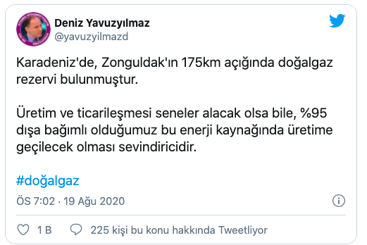 Yavuzyılmaz, sosyal medya hesabından yaptığı paylaşımda, Zonguldak açıklarından doğalgaz rezervi bulunduğunu yazdı. Yavuzyılmaz, “Karadeniz’de, Zonguldak’ın 175 km açığında doğalgaz rezervi bulunmuştur. Üretim ve ticarileşmesi seneler alacak olsa bile, %95 dışa bağımlı olduğumuz bu enerji kaynağında üretime geçilecek olması sevindiricidir” dedi.