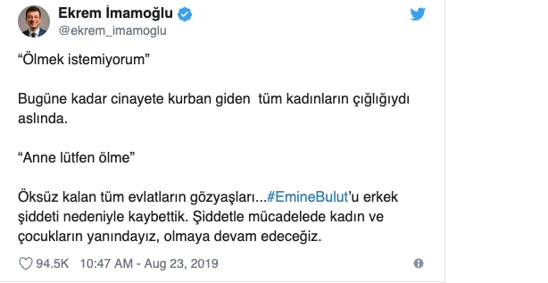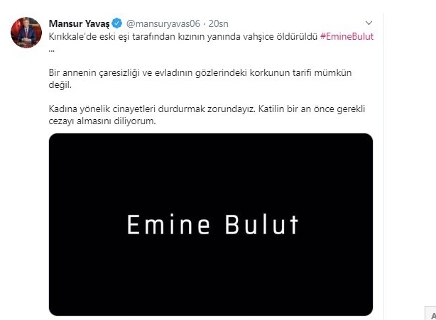 Çok sayıda siyasetçi, sosyal medya fenomenleri, kurumlar ve sanatçılar geçtiğimiz gün eski eşi tarafından çocuğunun yanında boğazından bıçaklanan Emine Bulut’un ölümüyle ilgili sessiz kalmayarak sosyal medya hesaplarından tepki gösterdiler.
