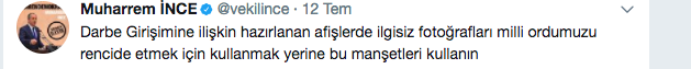 Muharrem İnce Twitter hesabından yapmış olduğu açıklamada ” Darbe Girişimine ilişkin hazırlanan afişlerde ilgisiz fotoğrafları milli ordumuzu rencide etmek için kullanmak yerine bu manşetleri kullanın” açıklaması yaptı.