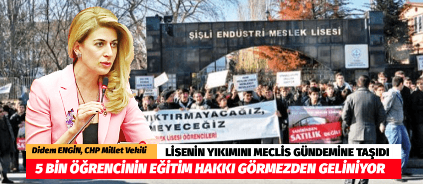 İstanbul’un, doğal güzellikleri kadar geçmişten bizlere miras kalan tarihî yapıları ve köklü kurumlarıyla da eşsiz bir şehrimiz olduğunu belirten Didem ENGİN, “Dünyada eşi benzeri olmayan tarihî silüetinin gökdelenlerle tahrip edildiği İstanbul’da beton sevdalıları şimdi de gözlerini tarihî Şişli Endüstri Meslek Lisesi arazisine dikti. Tarihî lisenin arsasına alışveriş merkezi ve rezidans dikilebilsin diye 5 bine yakın öğrencinin eğitim hakkı görmezden geliniyor” dedi.