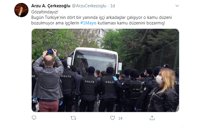 Bugün Türkiye’nin dört bir yanında işçi arkadaşlar çalışıyor o kamu düzeni bozulmuyor ama işçilerin #1Mayıs kutlaması kamu düzenini bozarmış!” dedi.