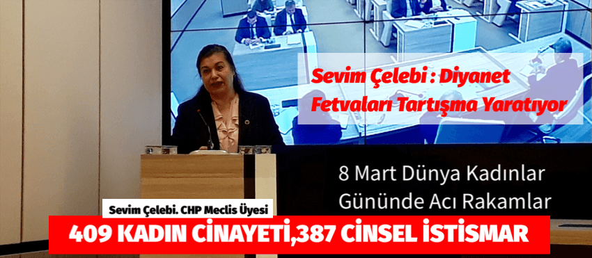 Sarıyer Belediye Meclisinde, 8 Mart Dünya Kadınlar Günü anma konuşması yapan Sarıyer CHP Meclis Üyesi Sevim Çelebi, Diyanet İşleri fetvaları tartışma yaratıyor, Bazı hocaların sosyal medyada açıklamaları toplumu derinden yaralıyor, her yıl artan kadın cinayetleri 2017 yılında rekor kırdığını belirtti.