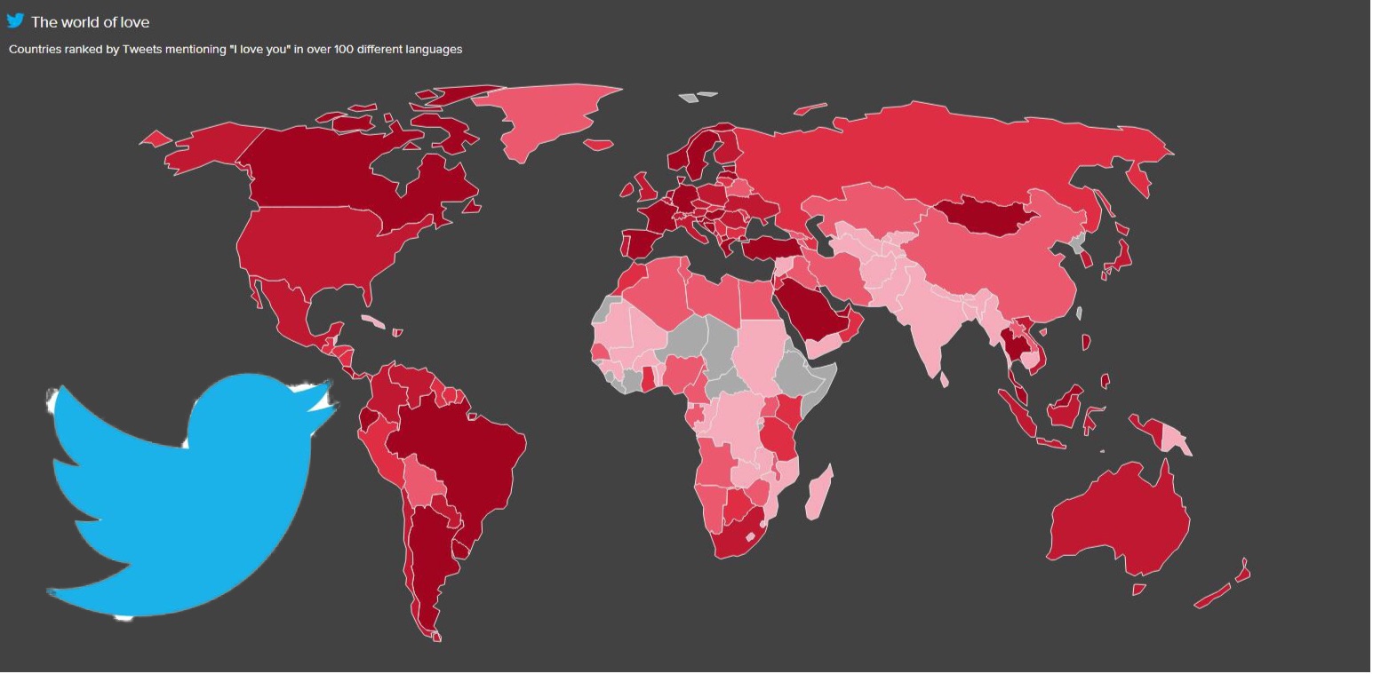 Gerçek hayatta olan herşey anında Twitter’da da yer alıyorsa, aşk neden bir istisna olsun? “Seni seviyorum,” “I love you”, “Je t’aime,” “te amo,” “ik hou van jou,” “???” gibi farklı dillerdeki sevgi sözcükleri her gün Twitter’da milyonlarca kez paylaşılıyor. Biz de Sevgililer Günü’nü fırsat bilerek bu sevgi mesajlarının en çok hangi ülkeler de paylaşıldığını sizler için araştırdık. Bu listede “Seni Seviyorum” diyen Türkler 6. sırada