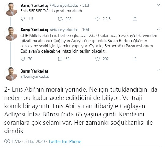 Enis Berberoğlu’nun Çağlayan Adliyesi‘ne getirildiğini duyuran Yarkadaş’ın mesajı şöyle: