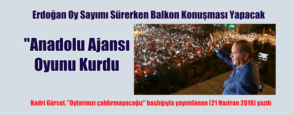 Cumhuriyet yazarı Kadri Gürsel, CHP Genel Başkanı Kemal Kılıçdaroğlu’nun 24 Haziran’da yapılacak cumhurbaşkanlığı ve genel milletvekili seçimlerine ilişkin olarak “Anadolu Ajansı, henüz oylar sayılırken erken bir saatte Recep Tayyip Erdoğan’ın cumhurbaşkanı seçimini ilk turda kazandığını ilan edecek. Ardından da, buna uygun olarak Erdoğan oy sayımı sürerken balkon konuşması yapacak. Bu sayede iktidarın dikkatleri Meclis oylarının sayımından kaçırması mümkün olacak” iddiasını dile getirdiğini aktardı.