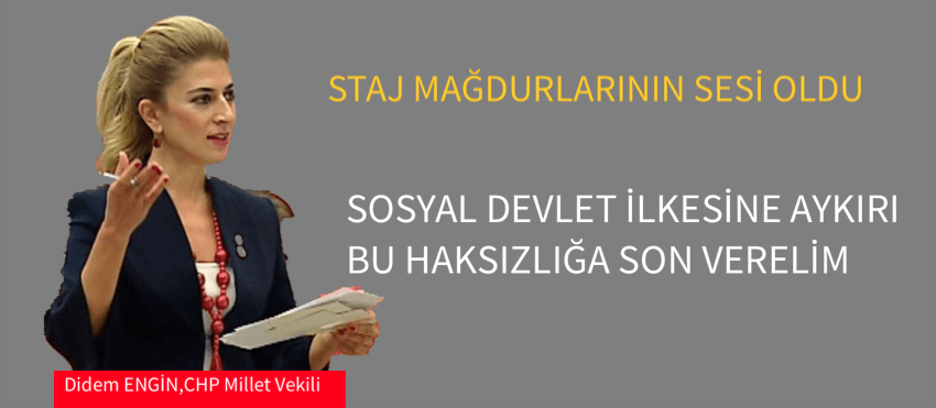 TBMM Genel Kurulu’nda bir konuşma yapan CHP İstanbul Milletvekili Didem ENGİN, kamuoyunda ‘staj mağdurları’ olarak bilinen vatandaşlarımızın taleplerini gündeme getirerek bütçe görüşmeleri öncesi staj mağduriyetine son verilmesi için Meclis’teki tüm partilere seslendi.