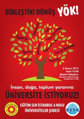 Gezi isyanının bize açtığı yoldan ilerleyebilmek, İTÜ’den ODTÜ’ye ortaya konan mücadeleyi yükseltebilmek için, yıllardan sonra bu 6 Kasım’da üniversite emekçileri olarak iş bırakarak, üniversite bileşenlerinin, emek güçlerinin, demokratik kitle örgütlerinin ve halkın ortak katılımıyla Beyazıt Meydanı’nda olacağız.