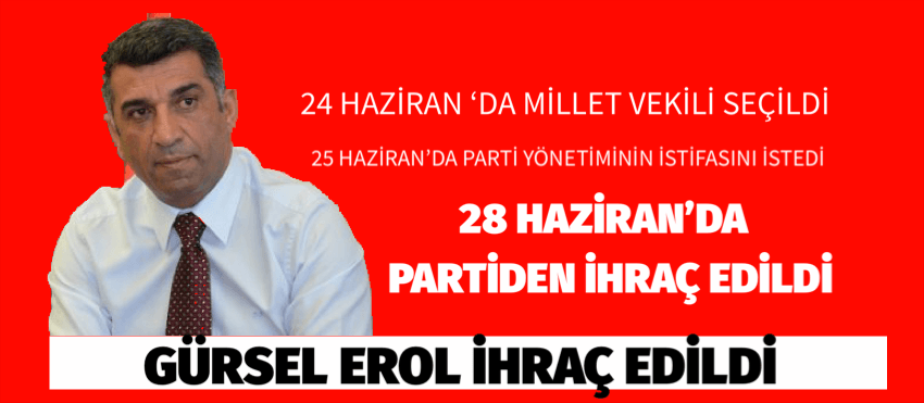 24 Haziran’da alınan sonucu eleştiren ve “İktidar olamamışsanız bunun bedelinin bir karşılığı olması lazım” diyen CHP Elazığ milletvekili Gürsel Erol, partiden ihraç edilmesi istemiyle disiplin kuruluna sevk edildi. Karar, Parti Meclisi’nde oy çokluğuyla alındı.