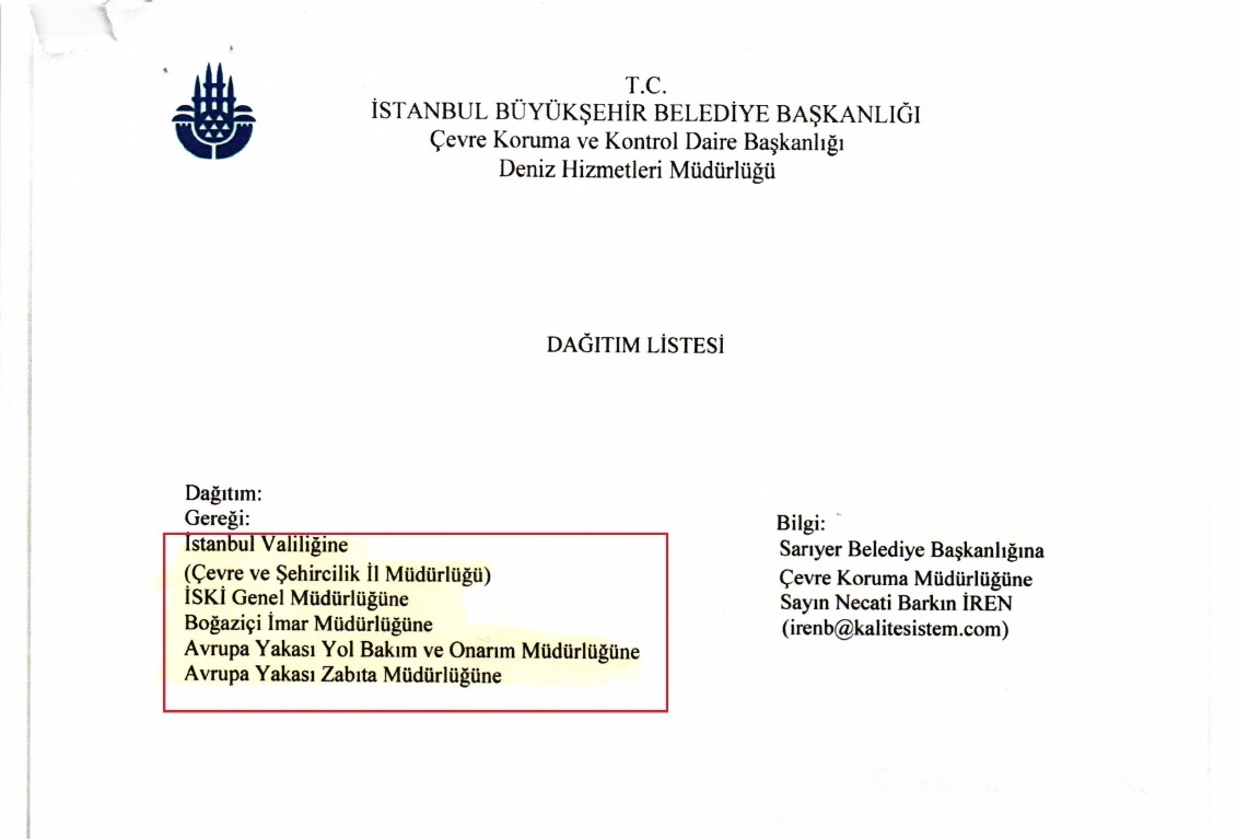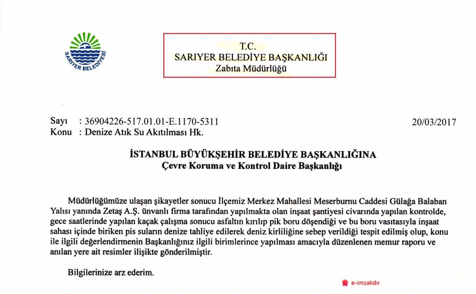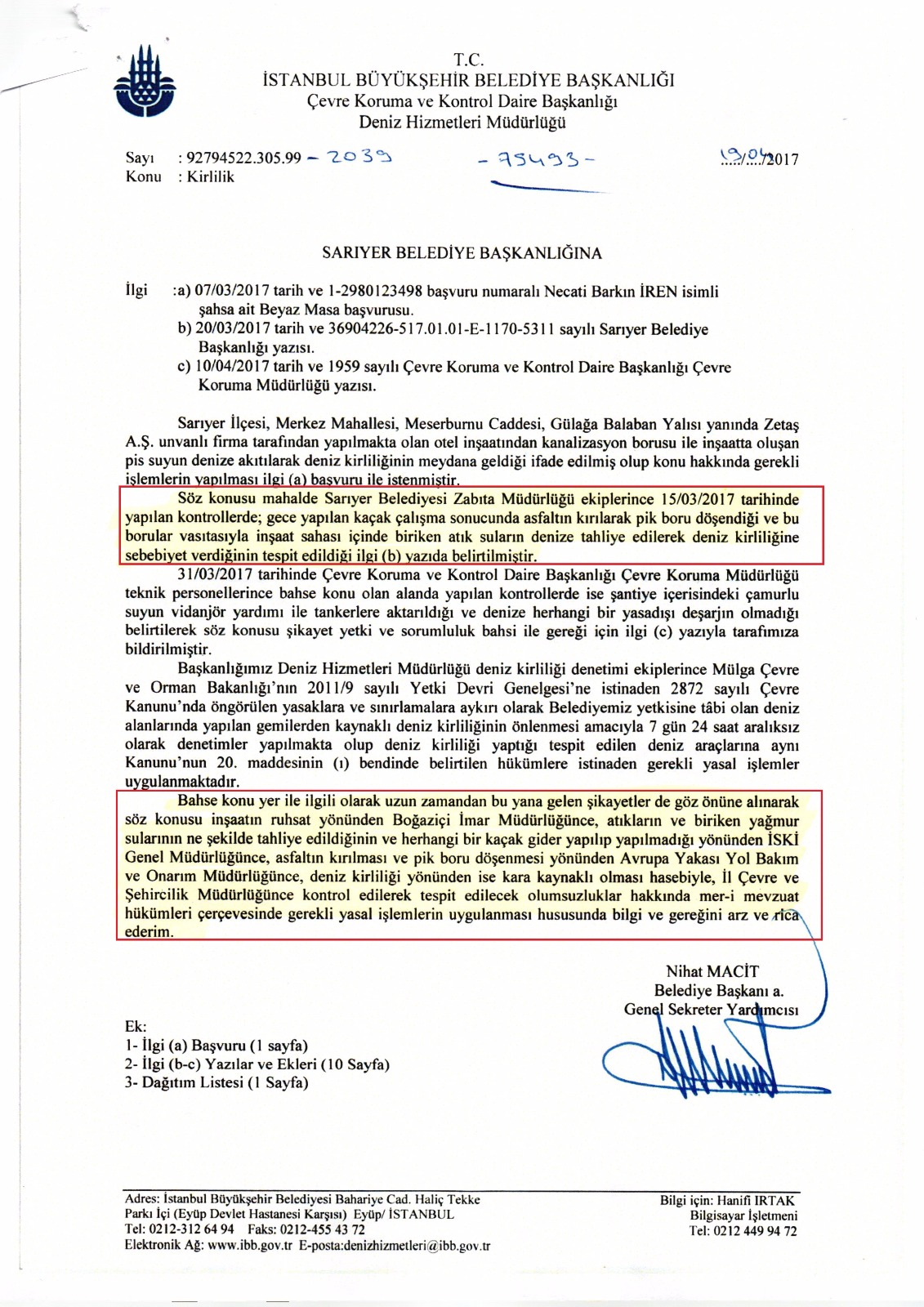 İBB Çevre Koruma ve Kontrol Daire Başkanlığı Deniz Hizmetleri Müdürlüğü 19.04.2017 tarihinde Sarıyer Belediyesine cevabını yazı ile bildirmiş. “ söz konusu mahalde Sarıyer Belediyesi Zabıta Müdürlüğü ekiplerince 15.03.12017 tarihinde yapılan kontrollerde, gece yapılan kaçak çalışma sonucunda asfaltın kırılarak pik boru döşendiği ve bu borular vasıtası ile inşaat sahası içinde biriken atık suların denize tahliye dilerek deniz kirliğiliğine sebebiyet verdiği ilgili (B) yazıda belirtilmiştir”.