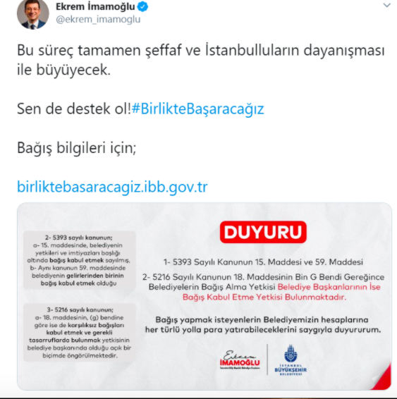 İstanbul Büyükşehir Belediyesi (İBB) Başkanı Ekrem İmamoğlu, Bakanlığın belediyelerin bağış kampanyasını hedef alan yazısının ardından belediyenin başlattığı bağış kampanyasını yineleyen bir paylaşım yaptı.