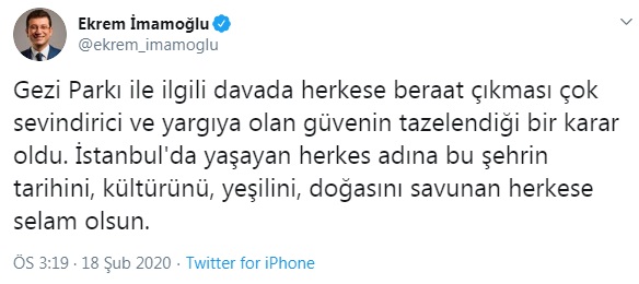 İmamoğlu’nun Gezi’ye beraat verilmesiyle ilgili sosyal medya hesabından yaptığı açıklama şöyle: