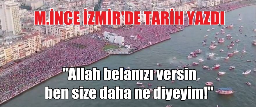 24 Haziran’a sayılı günler kala CHP’nin Cumhurbaşkanı adayı Muharrem İnce İzmir’de düzenlenen mitingde yaklaşık 2 buçuk milyon kişiyle bir araya geldi. Muhteşem kalabalık karşısında İnce, “Sahnenin önünde 1 milyon insan varsa 1 milyon kişi de sahnenin arkasında duruyor. Bu 49. günde 105. mitingimiz. Günlerdir konuşuyorum ama medya vermemekte ısrarlı. Hele bir TRT var, parayı bizden alıyor Erdoğan’ın borazanlığını yapıyor. Sizden ricam, hepiniz telefonlarınızdan canlı yayın yapın. Bir yanda Erdoğan’ın medyası, bir yanda milletin medyası” dedi.