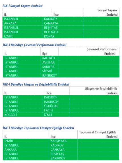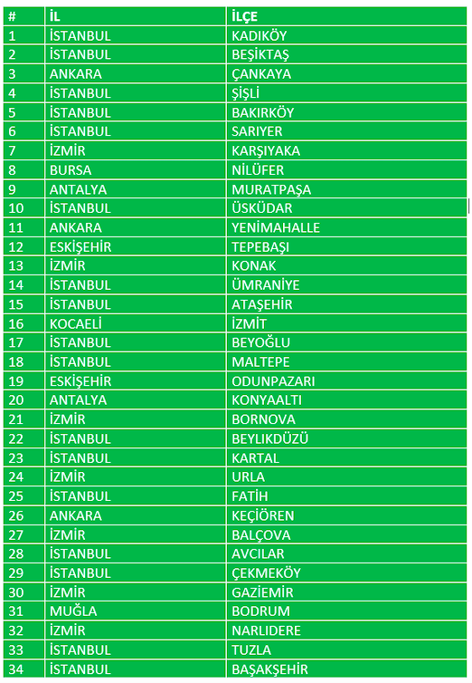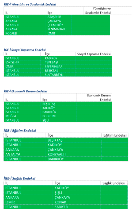 Bu endekslere göre ilk 5 sırada yer alan ilçeler şöyle:
