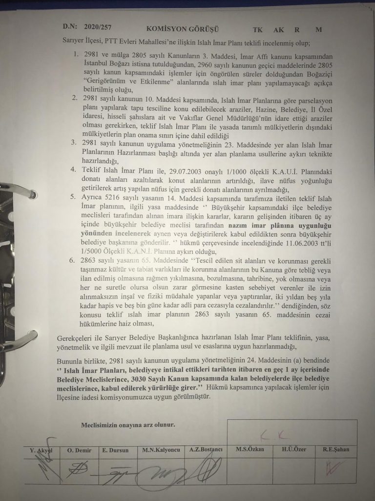 Sarıyer Belediye Başkanı Şükrü Genç, Sarıyer Belediyesi Teknik Başkan Yarıdımcısı Sevgi Atalay, Meclis Üyeleri ve Mahalleler Birliği temsilcileri ve Muhtarlar CHP grubunda uzun süren görüşmeler neticesinde, AKP Grubu ilede görüşülerek yapılan mutabakatta yeni çalışma grubu kurulması ve planların Sarıyer Belediyesine iadesi kararı alındı.