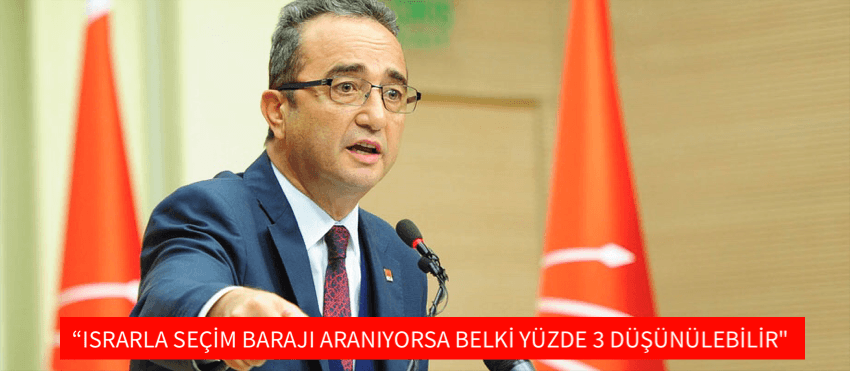 CHP Genel Başkan Yardımcısı Bülent Tezcan, MHP Genel Başkanı Devlet Bahçeli’nin seçim barajına ilişkin yaptığı açıklamayı değerlendirerek, “Barajlı siyaset, seçim, barajlı demokrasi demektir. Barajlı demokrasi de eksik veya olmayan demokrasidir. Seçim barajının olmaması gerektiğini düşünüyoruz. Seçim barajı hiç olmamalıdır. Israrla seçim barajı aranıyorsa belki yüzde 3 düşünülebilir. Ama arzu edilen hiç olmaması” dedi.