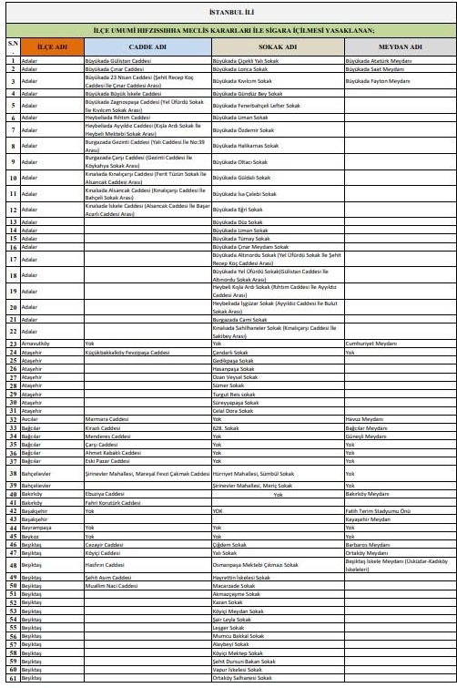 İstanbul’da sigara yasağı listesi yayınlandı. Sigara yasağı getirilen sokakların listesi İstanbul.gov.tr adresinde yayınlandı.
