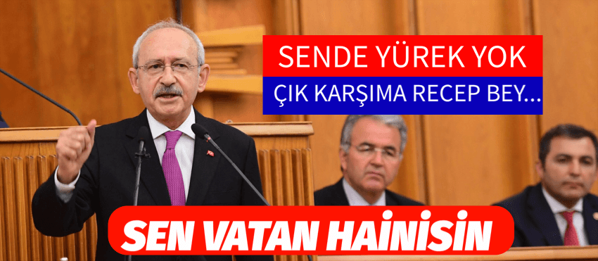 CHP lideri Kemal Kılıçdaroğlu partisinin grup toplantısında konuştu. Cumhurbaşkanı Recep Tayyip Erdoğan’a seslenen Kılıçdaroğlu, “Garibanı görünce esersin, yurt dışına üfürürsün ama benim karşıma çıkmaya cesaret edemezsin. Sende o yürek yok, o yürek. Dünya kadar televizyonun, gazetelerin var. Çık karşıma Recep Bey, çık karşıma” dedi.