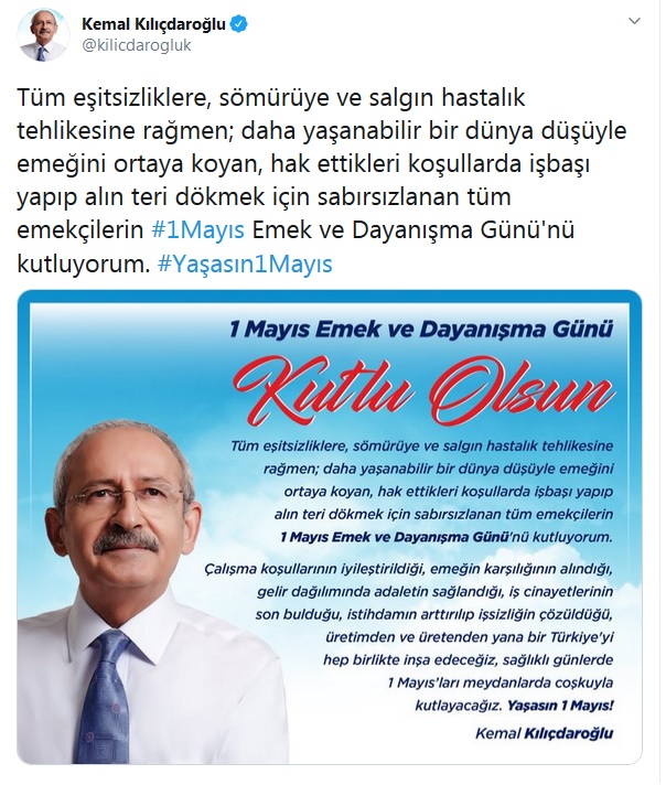 “Tüm eşitsizliklere, sömürüye ve salgın hastalık tehlikesine rağmen; daha yaşanabilir bir dünya düşüyle emeğini ortaya koyan, hak ettikleri koşullarda işbaşı yapıp alın teri dökmek için sabırsızlanan tüm emekçilerin #1Mayıs Emek ve Dayanışma Günü’nü kutluyorum. #Yaşasın1Mayıs”