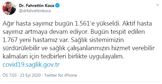 Bakan Koca, Twitter’daki mesajında, “Ağır hasta sayımız bugün 1561’e yükseldi. Aktif hasta sayımız artmaya devam ediyor. Bugün tespit edilen 1767 yeni hastamız var. Sağlık sistemimizin sürdürülebilir ve sağlık çalışanlarımızın hizmet verebilir kalmaları için tedbirleri birlikte uygulayalım” ifadelerini kullandı.