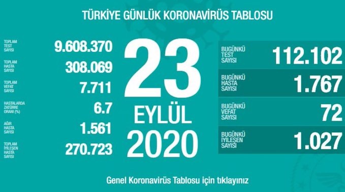 Bakan Koca’nın açıkladığı Türkiye Günlük Koronavirüs Tablosu’na göre bugün 112 bin 102 test yapıldı. Bunlardan 1767’si pozitif çıkarken, 72 kişi hayatını kaybetti, bin 27 kişi iyileşerek taburcu edildi. Tabloda toplam test sayısı 9 milyon 608 bin 370, toplam hasta sayısı 308 bin 069, toplam vefat sayısı 7 bin 711, hastalarda zatürre oranı yüzde 6.7, ağır hasta sayısı 1561, toplam iyileşen hasta sayısı ise 270 bin 723 olarak yer aldı.