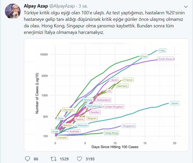 *Türkiye kritik olgu eşiği olan 100’e ulaştı. Az test yaptığımızı, hastaların %20’sinin hastaneye gelip tanı aldığı düşünürsek kritik eşiğe günler önce ulaşmış olmamız da olası. Hong Kong, Singapur olma şansımızı kaybettik. Bundan sonra tüm enerjimizi İtalya olmamaya harcamalıyız.
