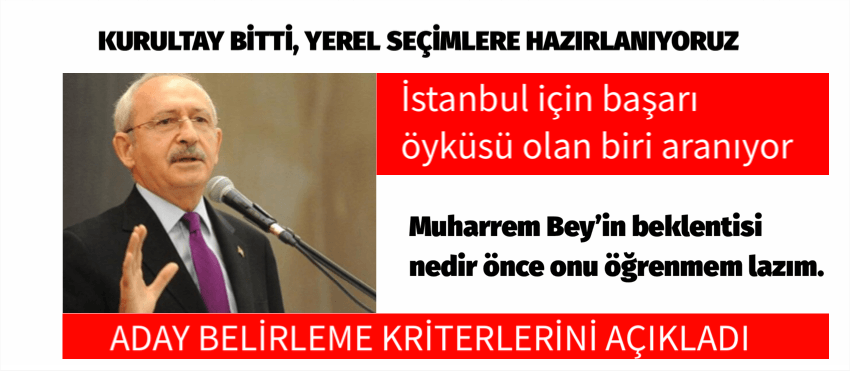İNCE İSTANBUL ADAYI OLUR MU?: İstanbul’u kesin alacağız. İstanbul’u arkasında başarı hikayesi olan birisiyle almamız mümkün. Bu çerçevede örgütle de beraber yapacağımız kamuoyu yoklamaları, diğer çalışmalar, örgütün bu konudaki eğilimi, İstanbul milletvekilleri… Bütün bunları dikkate alarak bir aday belirleyeceğiz. Muharrem Bey İstanbul’u ister mi istemez mi bilmiyorum. Öyle bir düşüncem yok. Başarı öyküsü olan birisi olması gerektiği kanaatindeyim.