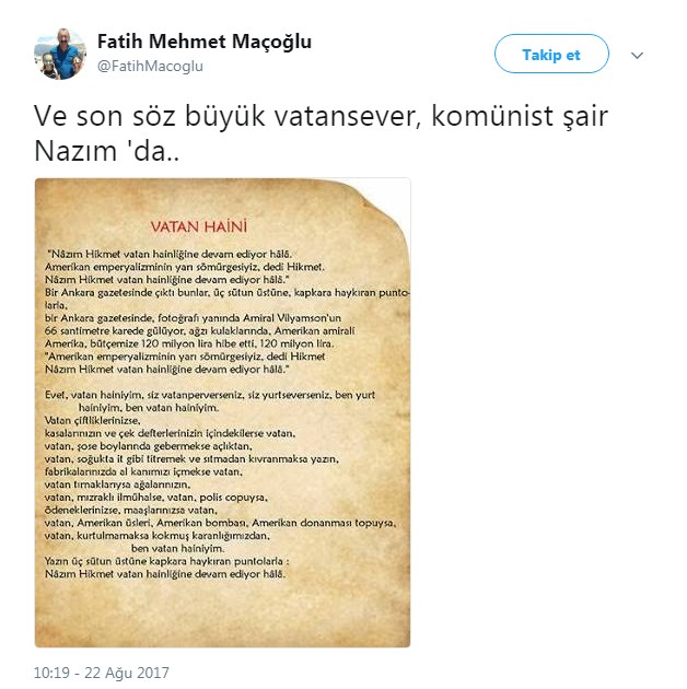 Maçoğlu, bu açıklamasının ardından “Ve son söz büyük vatansever, komünist şair Nazım ‘da…” ifadelerini kullanarak Nazım Hikmet’in “Vatan Haini” şiirini paylaştı.