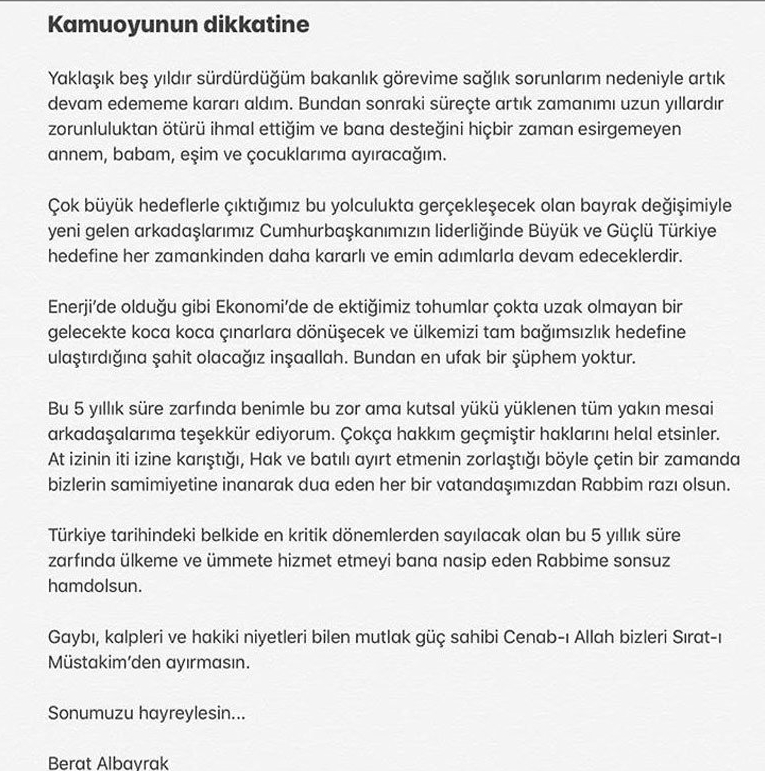 Maliye Bakanı Berat Albayrak, sosyal medya hesabından yaptığı açıklamayla istifa ettiğini duyurdu.