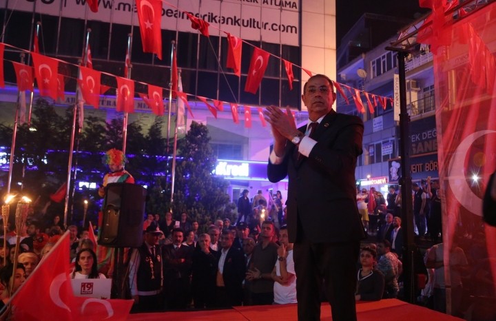 Burada bir konuşma yapan ve Belediye Başkanı Ali Kılıç’ın selamlarını ileten Belediye Başkan Yardımcısı Savaş Eroğlu, “1919’dan bugüne 100 yıl geçti. Ben de sizlerin bayramını yüz binlerce, milyonlarca kez kutluyorum ve inanıyorum ki Türkiye Cumhuriyeti ilelebet payidar kalacaktır. Bundan en ufak bir endişeniz olmasın. Bu gençliği, bu halkı gördükçe göğsüm kabarıyor, buna olan inancım daha da artıyor. Türkiye Cumhuriyeti’nin demokratik, laik ve çağdaş bir devlet olması için temellerinin atıldığı büyük bir gün. Bu saydığım değerlerin korunması, kollanması ancak bir ulusun mücadele azmi ve kararlılığıyla mümkün olacaktır. Atatürk ve silah arkadaşları tümümüze emanet ettiği bu yüce değerlerin korunması hepimizin asli görevidir. Atatürk Gençliğe Hitabe’sinde özellikle bu büyük, anlamlı görevi Türk gençliğine yüklemiştir. Atatürk gençliğinin hedefi, tam bağımsızlık, demokrasi, özgürlük, laiklik, devrimcilik, hürriyet gibi yüce kavramları özümsemek ve yaşatmaktır” dedi.