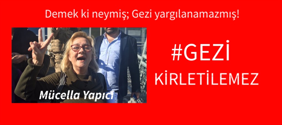 Gezi parkı davasında ağırlaştırılmış müebbet hapis istemiyle yargılanan ve bugün görülen duruşmada beraat eden Mücella Yapıcı duruşma çıkışında alkışlarla karşılandı. Yapıcı “Demek ki neymiş; Gezi yargılanamazmış! Gezi yargılanamaz! Gezi onurdur. Gezi kirletilemez” dedi.