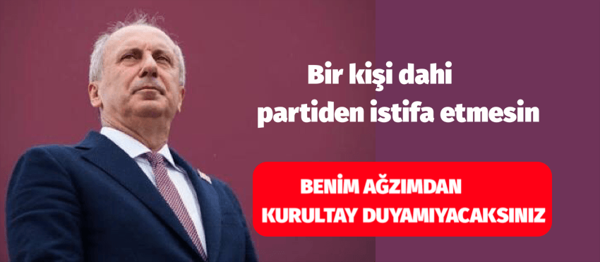 CHP’nin cumhurbaşkanı adayı İnce, “Bir kişi dahi partiden istifa etmesin. Herkes yerinde kalsın. Benim ağzımdan kurultay diye bir şey duyarsanız o zaman konuşursunuz ama duyamayacaksınız.” dedi.