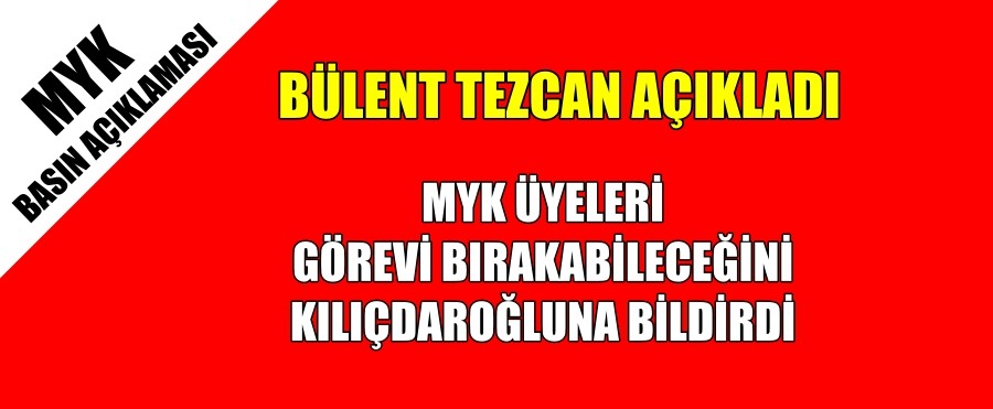 Tezcan, “Bütün MYK üyeleri Genel Başkanı destekliyor. Bugün de istemesi durumunda yeni yönetim için görevi bırakabileceklerini ilettiler. Umuyorum ve tahmin ediyorum CHP’nin önümüzdeki dönem siyasetini belirlemek ve yönünü çizmek için yeni yönetimi Genel Başkan oluşturacaktır. Sayın genel başkana ihtiyaç duyduğu desteği vereceğimiz ilettik. MYK’yı atamak ve değiştirmek Genel Başkan’ın elinde, MYK üyeleri bu değişikliği destekleyeceğini ilettik” dedi.
