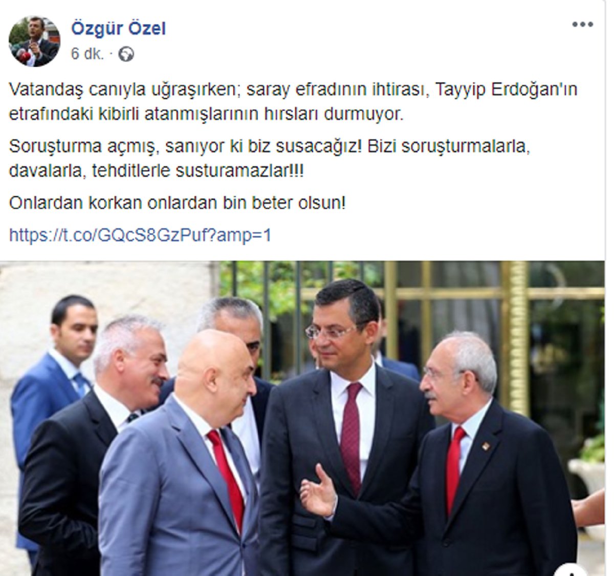 Özel mesajında “Vatandaş canıyla uğraşırken, saray efradının ihtirası, Tayyip Erdoğan’ın etrafındaki kibirli atanmışlarının hırsları durmuyor. Soruşturma açmış, sanıyor ki biz susacağız! Bizi soruşturmalarla, davalarla, tehditlerle susturamazlar. Onlardan korkan onlardan bin beter olsun” ifadelerine yer verdi.