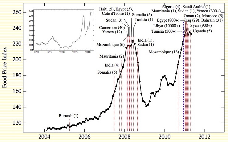 Bir başka dikkati çeken nokta ise bu gıda fiyalarının maksimum (peak) olarak artmış olduğu 2009 ve 2011 yıllarında değişik ülkelerde ayaklanmalar olmuştur. Bu ülkelerin isimleri grafiğin üstünde belirtilmiştir. Bu ülkeler büyük çoğunlukla halkın satın alma gücünün düşük olduğu ve beslenme için kendi gelirlerinden büyük kaynaklar ayırmak zorunda kalan ülkelerin halklarından oluşmakta olduğu görülmektedir. 2008 yılındaki gıda fiyatlarındaki artışta ABD’de ki finansal piyasalardaki çöküş ve de türev piyasalardan gelmiş olan spekülasyonlar rol oynamıştır. 2011 yılındaki gıda fiyatlarındaki anormal artış çok açık olarak “Arap Baharı”nı tetiklemiş bulunmaktadır! Her iki artışta da gıda fiyet endeksinde 210 olarak gösteren kritik kırmızı çizgi geçilmiş bulunmaktadır.