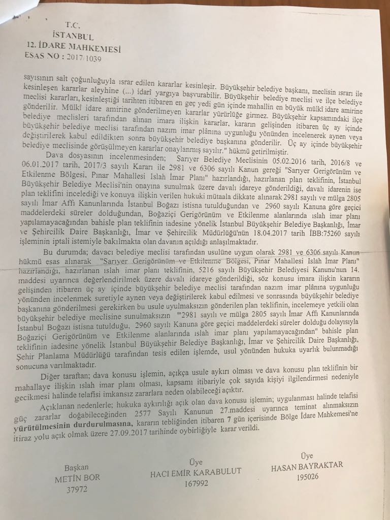 “ Pınar Mahallesi için alınan kararda : dava konusu işlemin, açıkça usule aykırı olması ve dava konusu plan teklifinin bir mahalleye ilişkin islah imar planı olması, kapsamı itibarıyle çok sayıda kişiyi ilgilendirmesi nedeniyle gecikmesi halinde telafisi telefisi imkansız zararlara neden olabileceği açıktır.