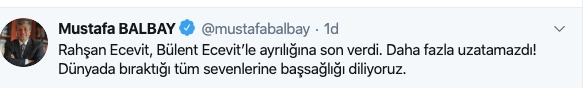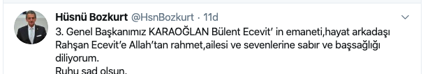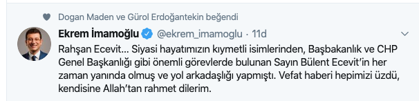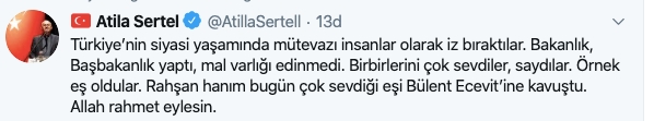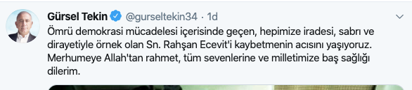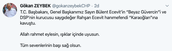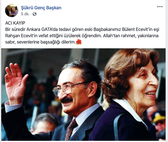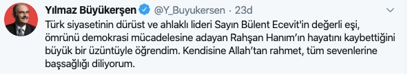 Eski Başbakanlardan Bülent Ecevitin eşi DSP Genel başkanlarından Rahşan Ecevit hayatını kaybetti, CHP Millet Vekilleri ve Siyasi parti temsilcileri sosyal medya hesaplarından başsağlığı dilediler.