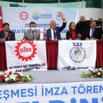 Sarıyer Belediyesi ile DİSK Genel – İş arasında yapılan toplu sözleşme görüşmeleri mutlu sonla noktalandı. Toplu sözleşmenin imza töreni Sarıyer Belediyesi Ana Hizmet Binası önünde gerçekleşti. İmza törenine; Sarıyer Belediye Başkanı Şükrü Genç, DİSK Genel Başkanı Arzu Çerkezoğlu, CHP İstanbul İl Başkanı Canan Kaftancıoğlu, Genel-İş Sendikası Genel Başkanı Remzi Çalışkan, Genel – İş İstanbul Avrupa Yakası 1 No’lu Şube Başkanı Mehmet Pehlivan ile belediye işçileri katıldı. Törende konuşan Sarıyer Belediye Başkanı Şükrü Genç her zaman emeğin ve emekçinin yanında olduğunu söyledi.