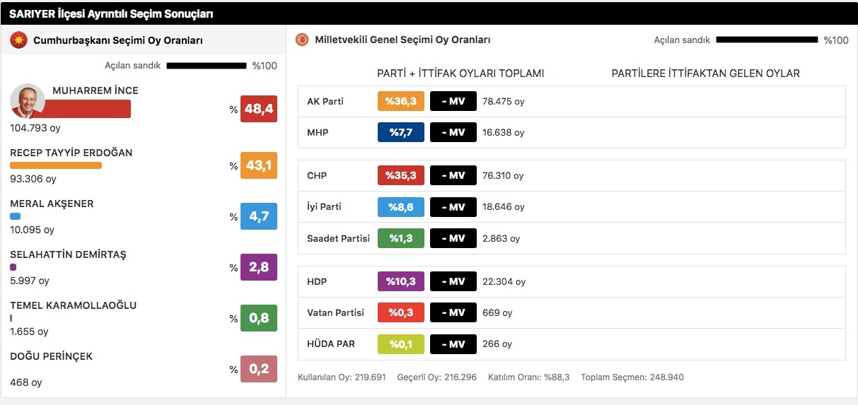 2018 Sarıyer’de Cumhurbaşkanı ve 27. Dönem Milletvekili Genel Seçimi Kesin Sonuçları.