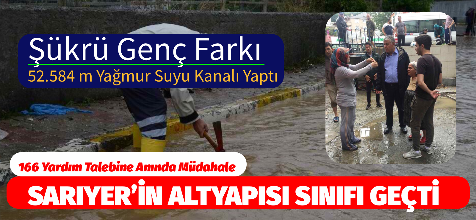 2009 yılından günümüze kadar daha yaşanılabilir bir ilçe için çalışan Sarıyer Belediyesi, bugüne kadar yaptığı 52.584 m yağmur suyu kanalı, 17.701 adet baca ıızgara yapımı ve yükseltme çalışmalarıyla sınıfı geçti. Belediyenin kendi imkanlarıyla yaptığı altyapılarda sağanak yağış boyunca herhangi bir sorun yaşanmadı.Göreve gelinen günden beri altyapı çalışmalarında rekor kıran Sarıyer Belediyesi ana arterden kaynaklı sorunlara da anında müdahale etti. Sabah erken saatlerden itibaren vatandaşın yardımına koşan Sarıyer Belediyesi ekipleri ve Sarıyer Belediye Başkanı Şükrü Genç, ilçeyi baştan sona tarayarak hasar tespiti yaptı. Ekipler acil müdahale edilmesi gereken evlerde temizlik ve iyileştirme çalışmaları gerçekleştirdi.